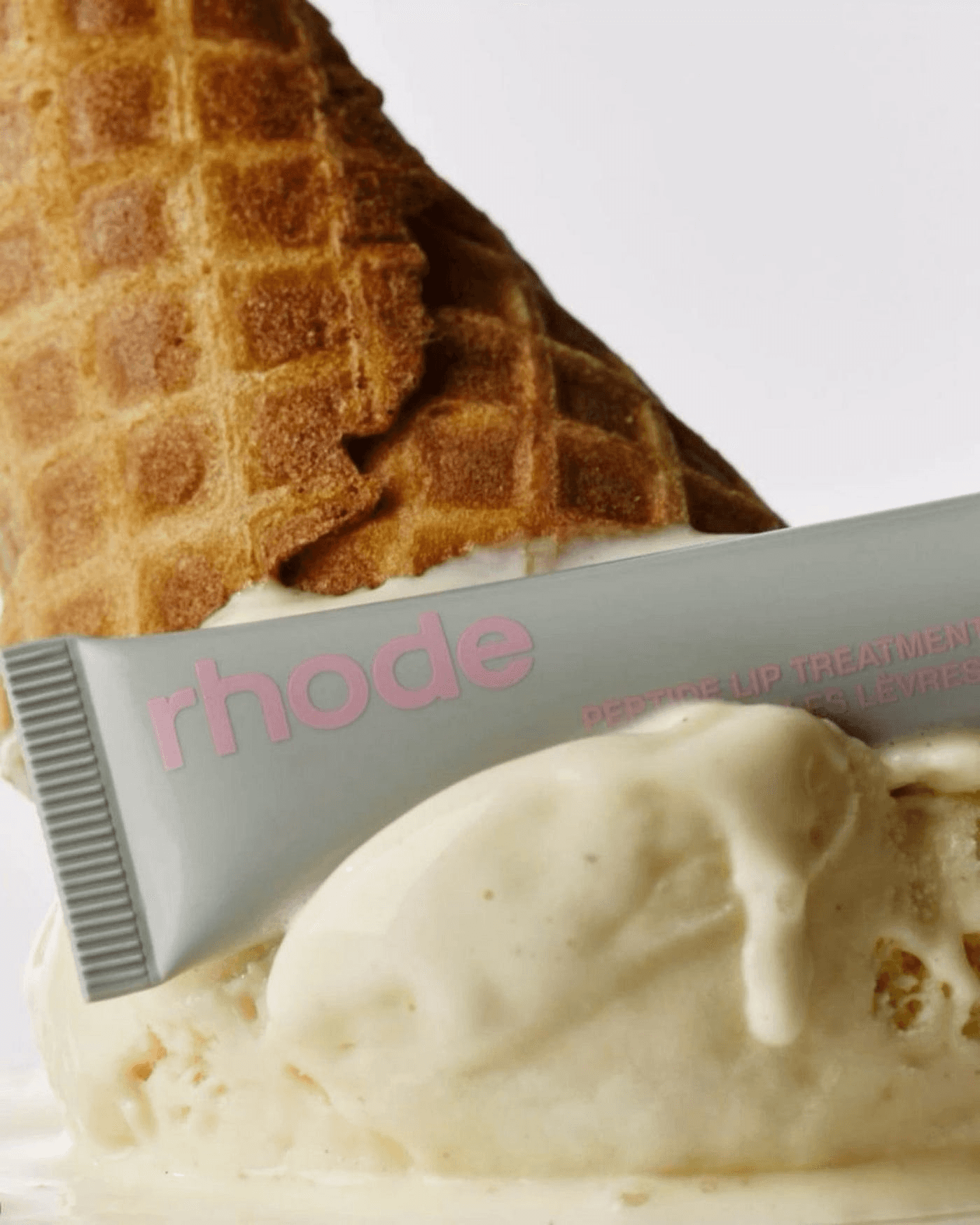 While the core visual system is neutral and soft, campaign visuals often contrast this with dramatic scale (e.g., giant sculptural lip tints) and textural cues like fruits, syrups, and glossy surfaces. Food is also a common design motif that enhances sensoriality—viewers can imagine, feel, and smell the flavor, texture, and hydration.